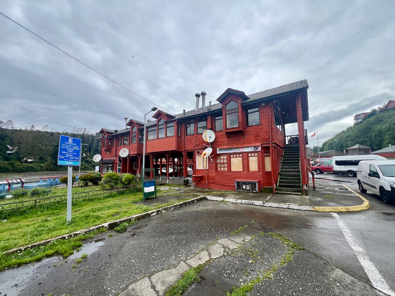 Während wir noch mit dem Essen zurück zum Auto laufen, fängt es dann aber leider doch relativ heftig an zu regnen. Das versaut uns dann doch auch etwas die weiteren Pläne. Von hier ist es eigentlich nur ein kurzer Weg zur Panoramastraße die den Vulkan hinauf führt. Wir versuchen auch den Weg noch anzutreten, merken aber schnell, dass unser Anliegen sinnlos ist. Die Straße ist teilweise schon mit sehr tiefen Pfützen übersät und die Wolken hängen sehr tief. Außerdem bekommen wir in Hinblick auf die doch recht lange Rückfahrt dann auch langsam Zeitdruck, sodass wir Verzögerungen durch den Regen eigentlich nicht riskieren können. Deshalb entscheiden wir uns irgendwann dazu umzudrehen, und machen uns auf den Weg zurück nach Puerto Montt.