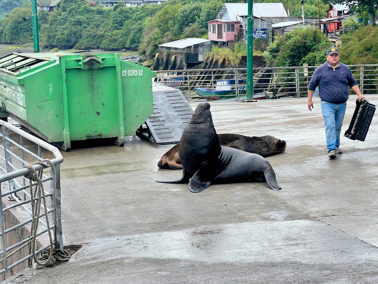 Zwei besonders relaxte Tiere haben es sich dann auch vor der besagten Mülltonne gemütlich gemacht. Als es ihnen dann aber zu bunt wurde, und die Touristen ihnen dann doch zu sehr auf die Pelle rückten, stellten sie eindrucksvoll unter Beweis wie schnell sie sich auch an Land trotz ihrer Größe bewegen können. Vor allem die beiden Herren, die unbedingt ein Foto aus nächster Nähe machen wollten, mussten auf einmal ganz schön zusehen wie sie wegkommen.