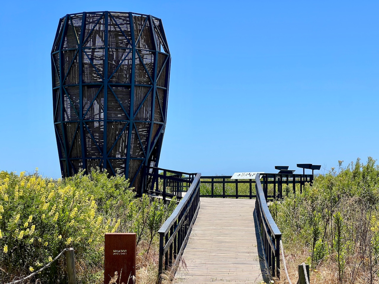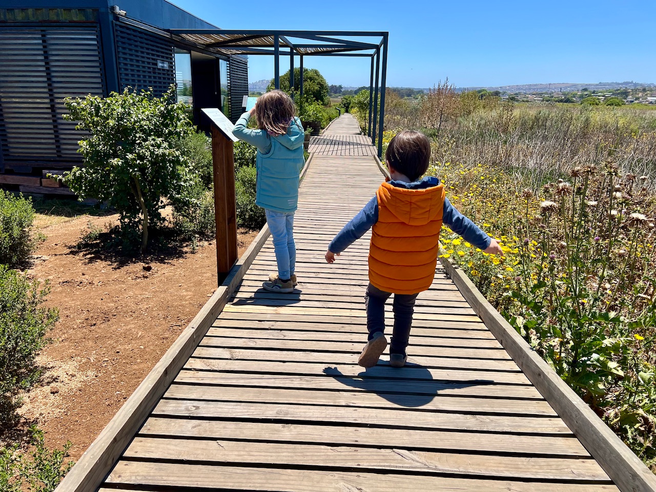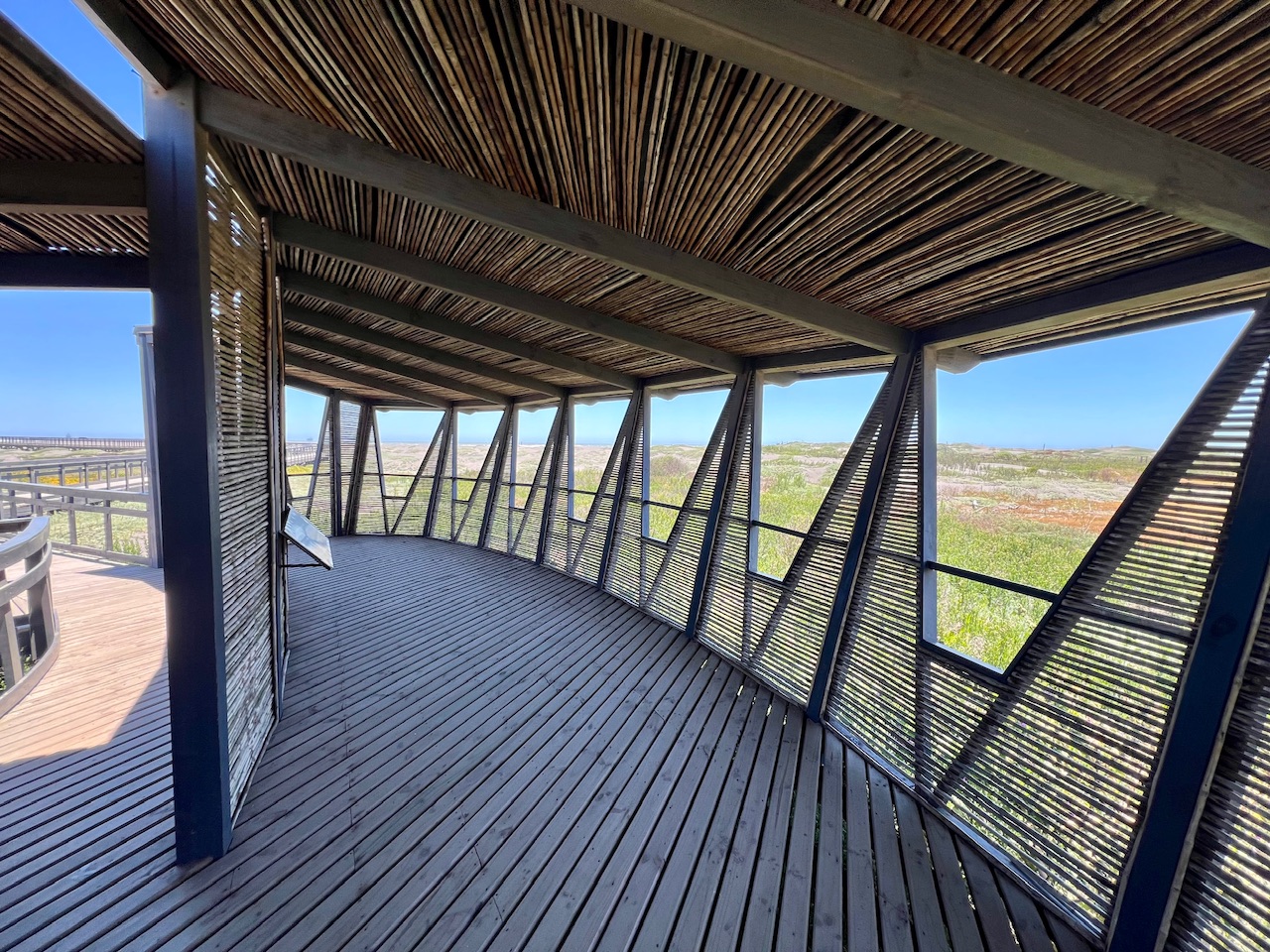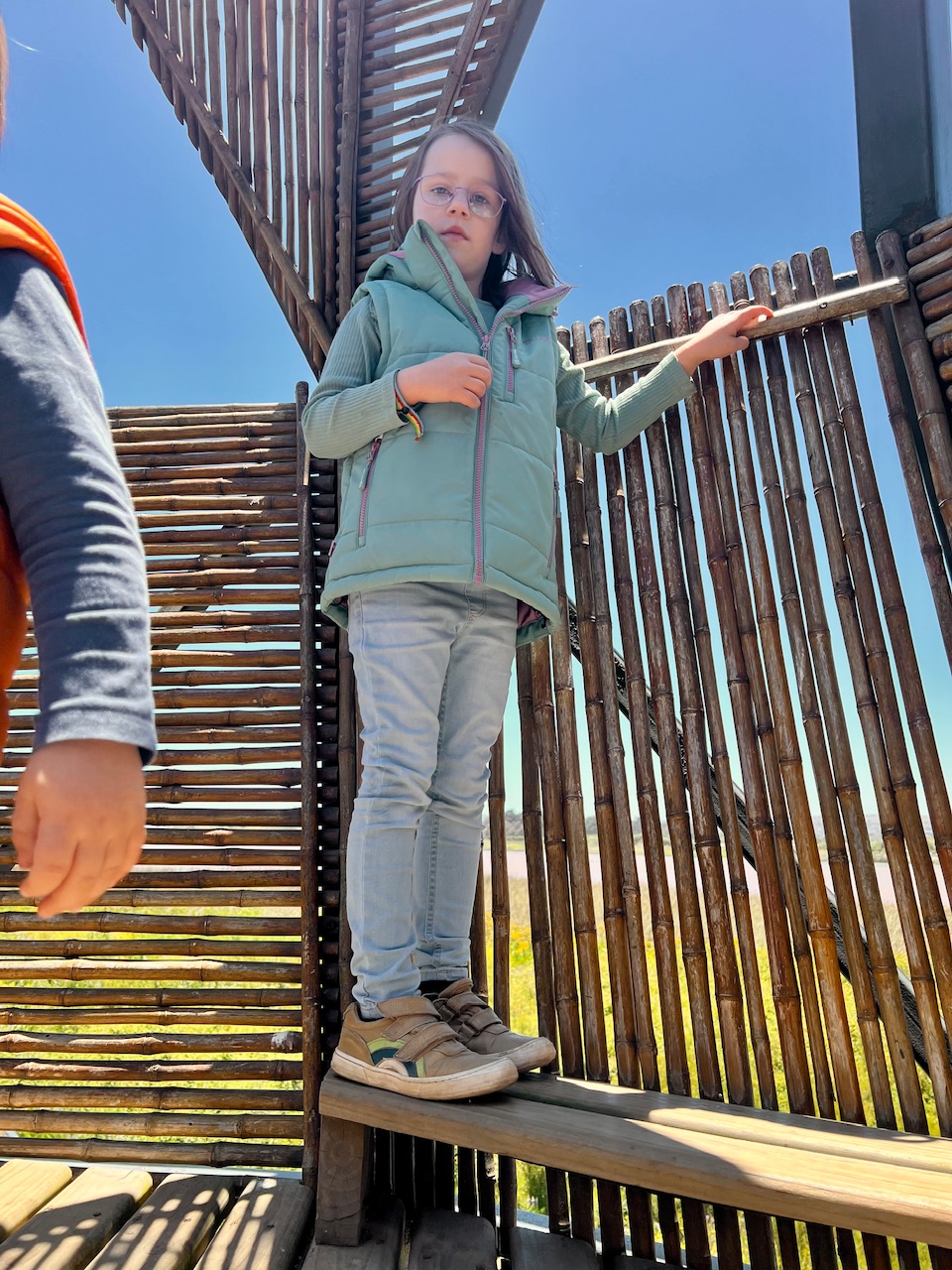 Von hier aus führt der Steg immer weiter bis zum Strand. Mittlerweile haben wir keine schützenden Dünen mehr um uns rum, und so ist es mittlerweile richtig windig geworden. Obwohl die Sonne die Luft eigentlich schön aufwärmt, tut der Wind einiges dafür um sie wieder abzukühlen. Wir laufen den Weg bis zum letzten Punkt vor dem Strand weiter. Hier gibt es ein kleines Häuschen was eigentlich genutzt werden soll um Vögel zu beobachten. Für uns eine gute Gelegenheit um die Energie der Kinder mit ein paar Snacks wieder aufzufüllen.