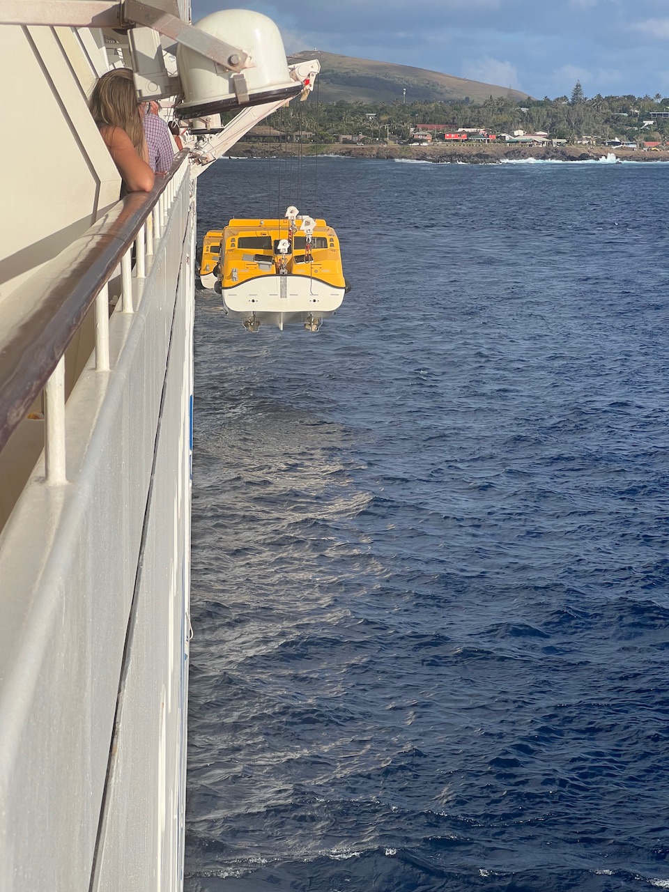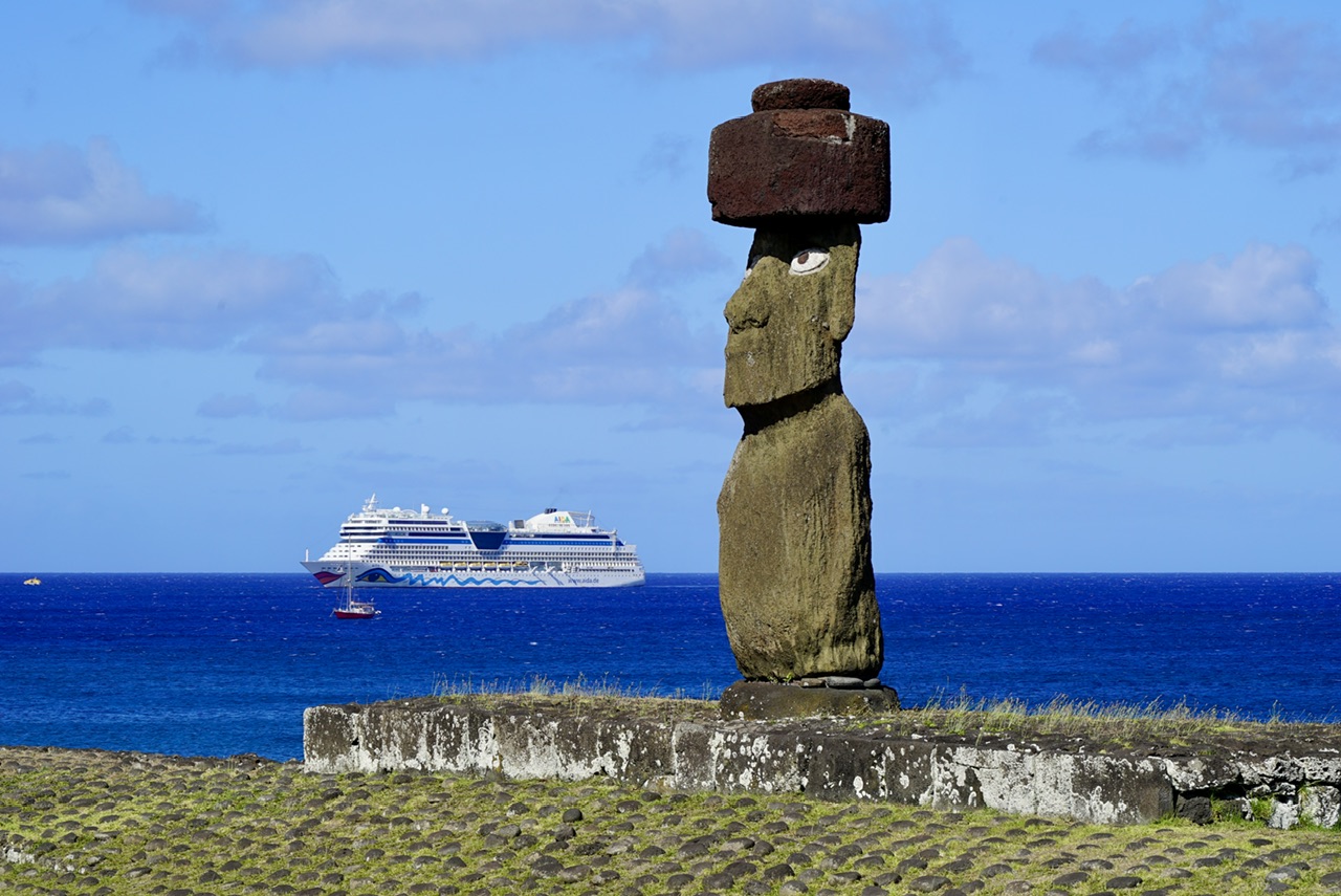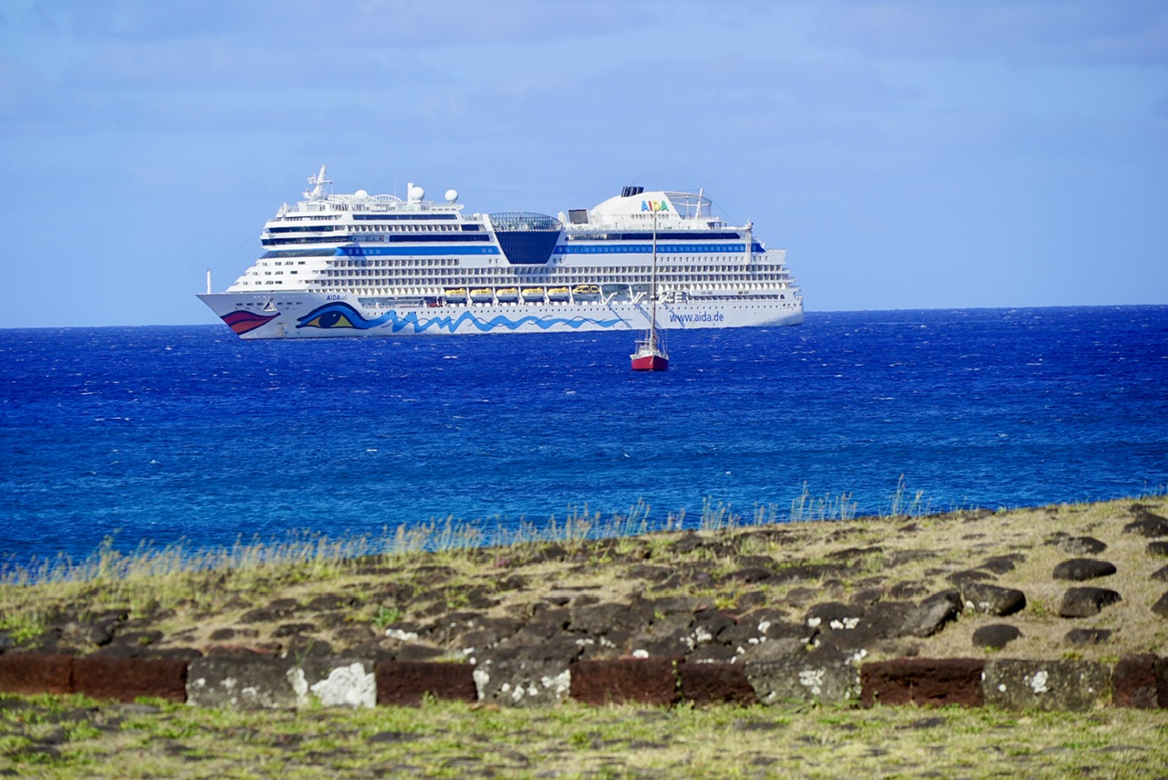 Nach unserem letzten fiebrigen Stop, sind nun ein paar Seetage vergangen. Diese haben durchaus zur Besserung des Gesamtzustandes beigetragen, und so blicken wir heute hoffnungsvoll auf den nächsten Stop auf der Osterinsel. Bei vielen anderen Reisen ist dieser Hafen berühmt für sein schlechtes Wetter, und muss aus diesem Grund sogar oft ausfallen. Der Hafen selbst ist so klein, dass nur ein einziges unserer Rettungsboote überhaupt hinein passt. Daran merkt man schon, unsere große Aida wird in einigen Metern Entfernung vor der Insel auf uns warten, und wir tendern erneut auf die Insel.