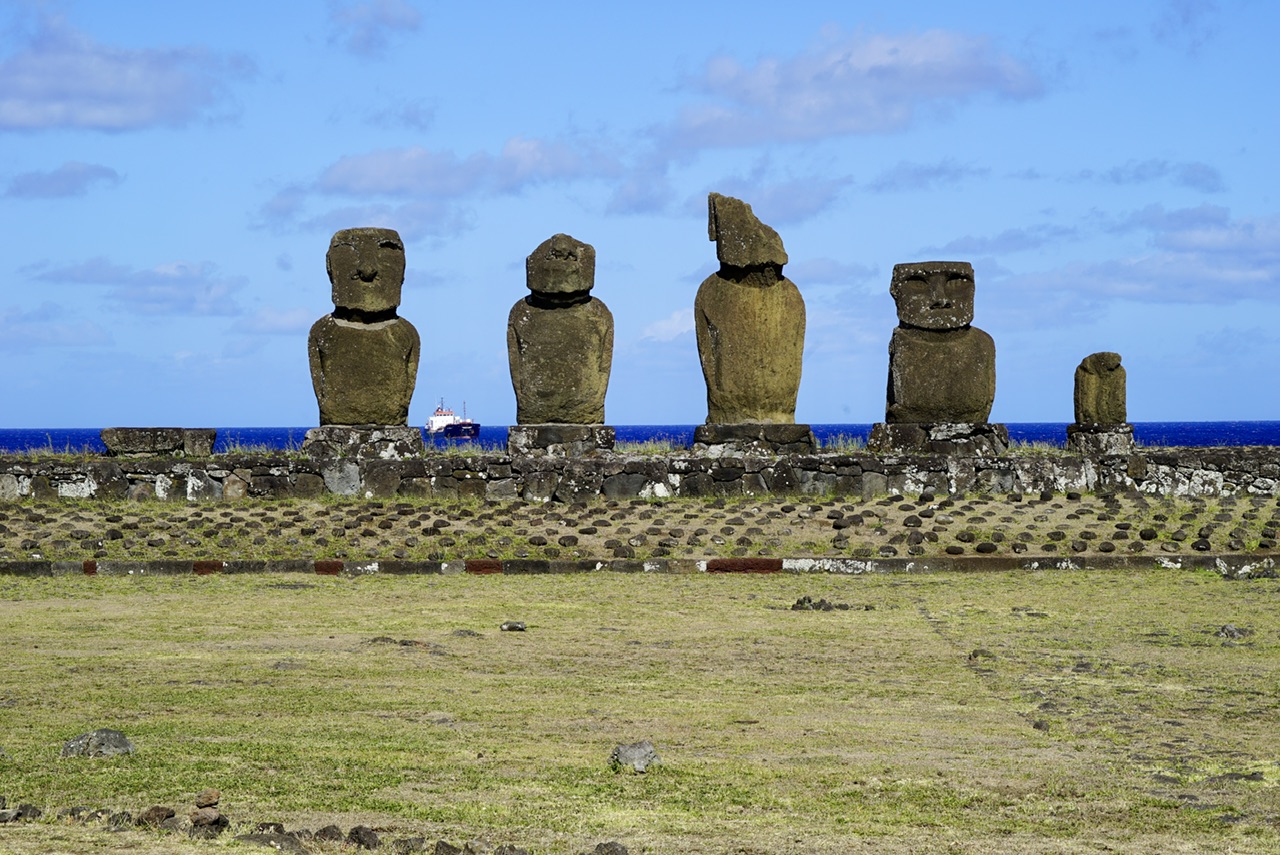 Der Tag neigt sich mittlerweile dem Ende zu, und für uns wird es Zeit zurück zum Schiff zu fahren. Nicht aber, ohne noch einen letzten weiteren Stop zu machen. Was denkt ihr, was wir nun noch besuchen? Richtig, weitere Steinköpfe. Wir besuchen Ahu Akivi. Diese sieben Figuren haben aber eine Besonderheit gegenüber alle anderen. Während alle Figuren stets mit dem Rücken zum Ozean stehen, schauen diese auf das offene Meer raus. Sie sind außerdem genau so ausgerichtet, dass sie zwei mal im Jahr perfekt in den Sonnenuntergang schauen. Immer dann, wenn der Tag und die Nacht exakt gleich lang sind. Aus diesem Grund geht man davon aus, dass diese Stätte auch für astronomische Untersuchungen genutzt wurde. Die Gruppe hier sind übrigens auch die einzigen, die nicht direkt am Ozean stehen.