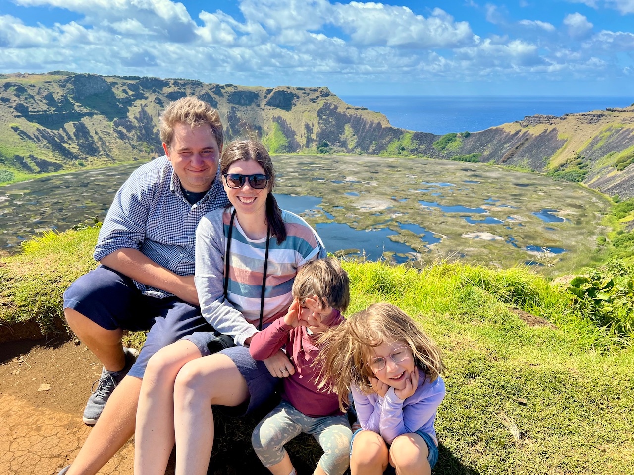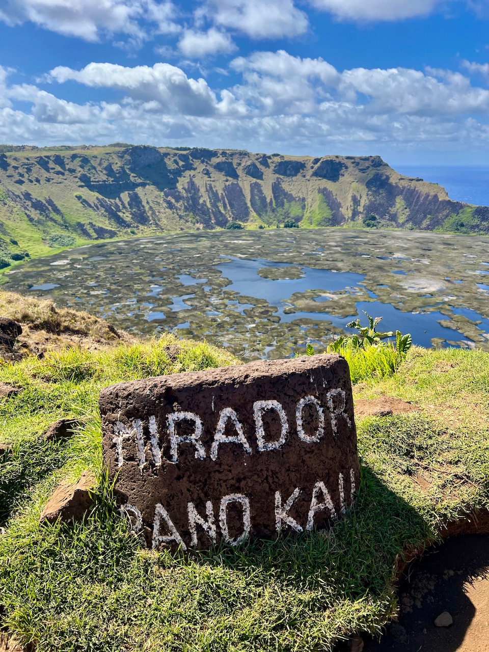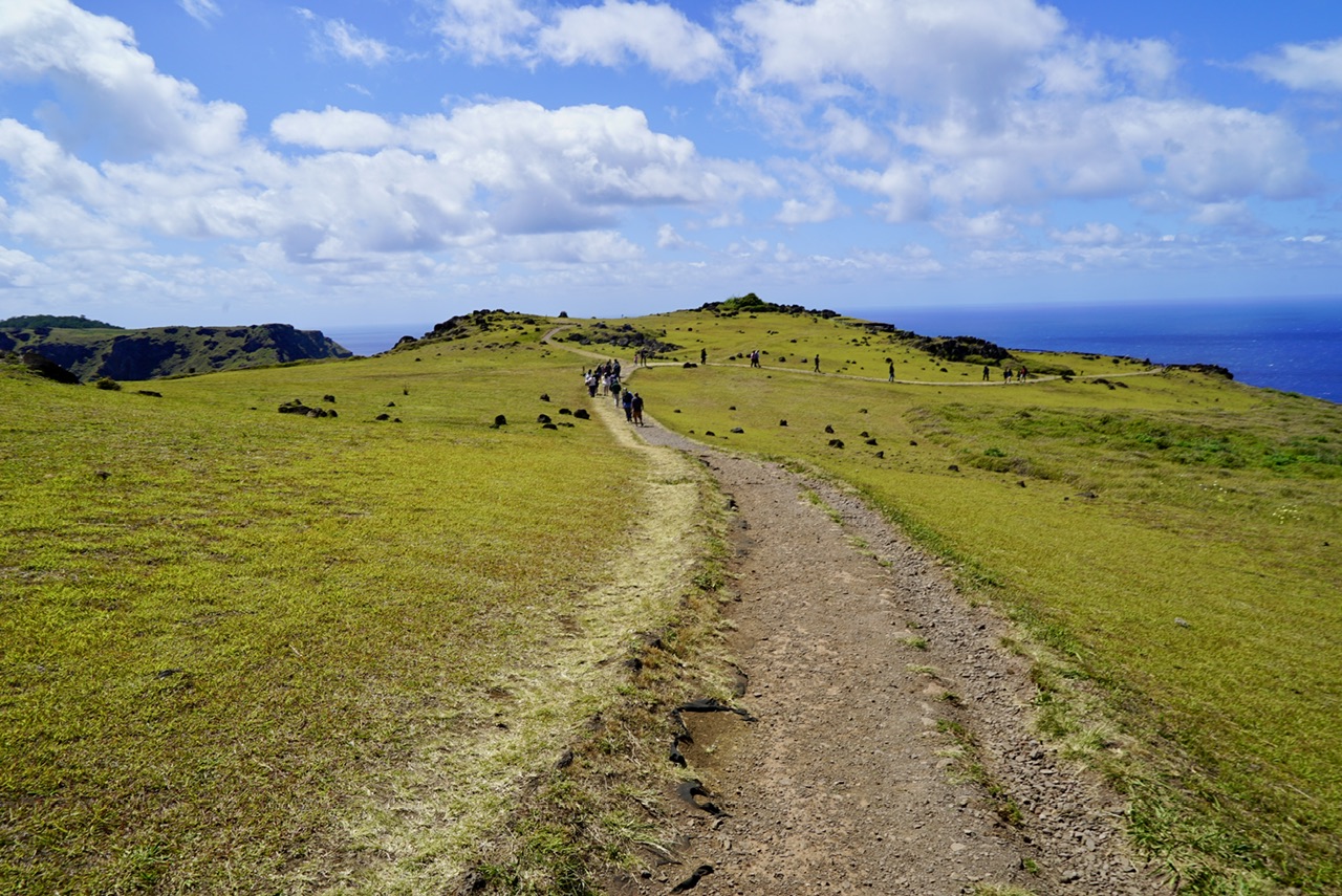 Wenn man sich die Osterinsel auf einem Luftbild anschaut, kann man deutlich die dreieckige Form der Insel erkennen. Diese Form ist entstanden, als die drei Hauptvulkane der Insel zuletzt gleichzeitig, beziehungsweise mit kurzem Abstand ausbrachen. Die Lava bildete eine Verbindung zwischen den Vulkanen auf dem Meeresgrund, und formte so die heutige Insel. Einen dieser drei Vulkane schauen wir uns nun als nächstes an. Der Krater des Vulkans Rano Kau hat einen Durchmesser von gerade mal einen Kilometer, und so hat man von der Spitze einen tollen Blick über den kompletten Krater.