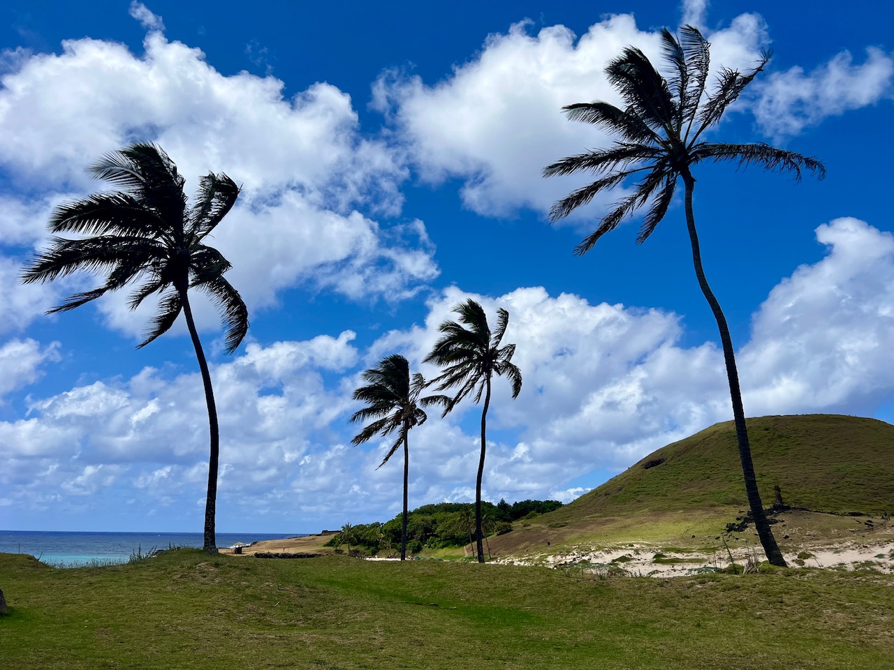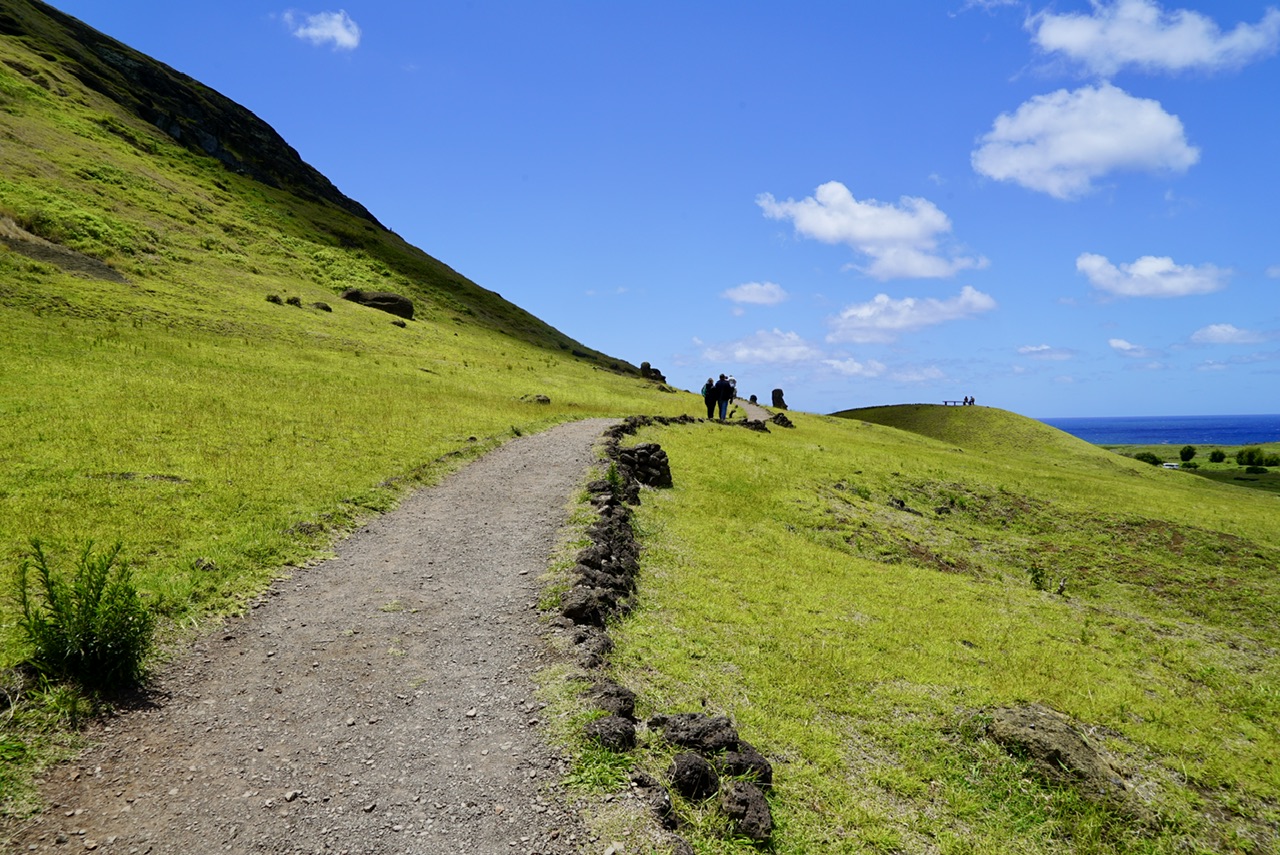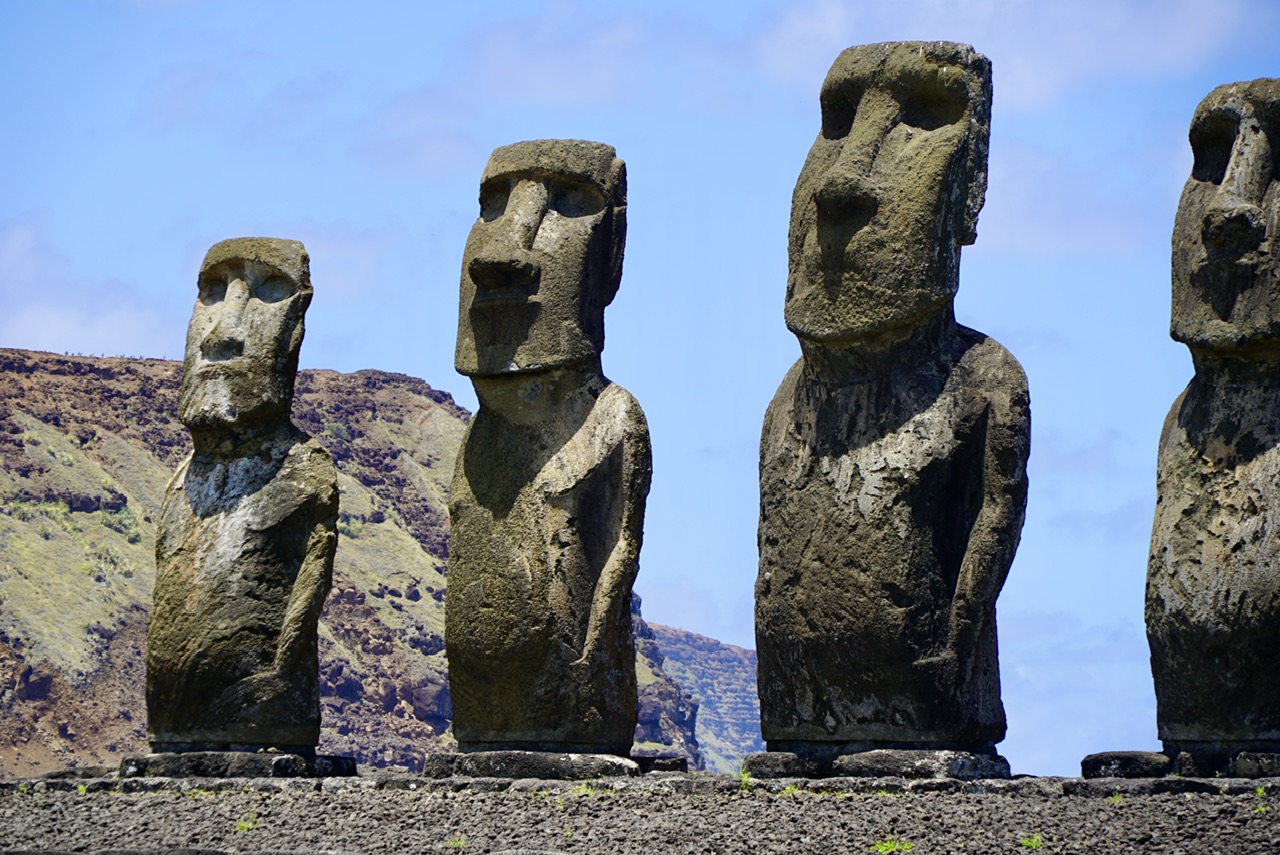 Vom Rundweg aus können wir auch schon unser nächstes Ziel sehen. Unser nächstes Ziel ist Tongariki. Es handelt sich um eine der wichtigsten archäologischen Stätten auf der Osterinsel. Besonders bekannt ist diese hier, weil es sich um eine Gruppe von 15 Steinköpfen handelt, die allesamt auf einer Platform direkt am Wasser stehen. Das ist die größte Ansammlung von Figuren in dieser Gegend. Besonders interessant ist, dass es sich hier tatsächlich um nachbauten der originalen Figuren handelt, diese wurden nämlich alle von einem Tsunami zerstört. Übrig geblieben sind nur noch die Frisuren der originalen Figuren, die noch heute auf der Wiese in einiger Entfernung liegen.