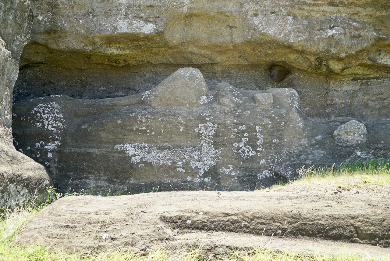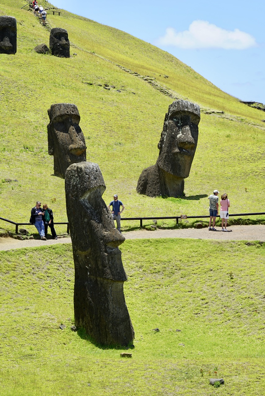 Es gibt zu den Figuren immer noch einen Mythos, der von den Forschern noch immer nicht final beantwortet werden konnte. Und das ist die Frage nach dem Transport der Figuren. Man weiß zwar, wo die Köpfe alle entstanden sind, aber nicht sicher wie sie von hier an ihren Bestimmungsort gekommen sind. Während man früher davon ausgegangen ist, dass die Figuren über Holzstämme gerollt worden sind, geht man heute davon aus, dass sie aufrecht stehend an ihren Ort getänzelt worden sind. Man hat also Seile um den Kopf der Figur gewickelt, und dann den ganzen Stein immer hin und her wackeln lassen und so dann teilweise mehrere Kilometer Strecke zurück gelegt.