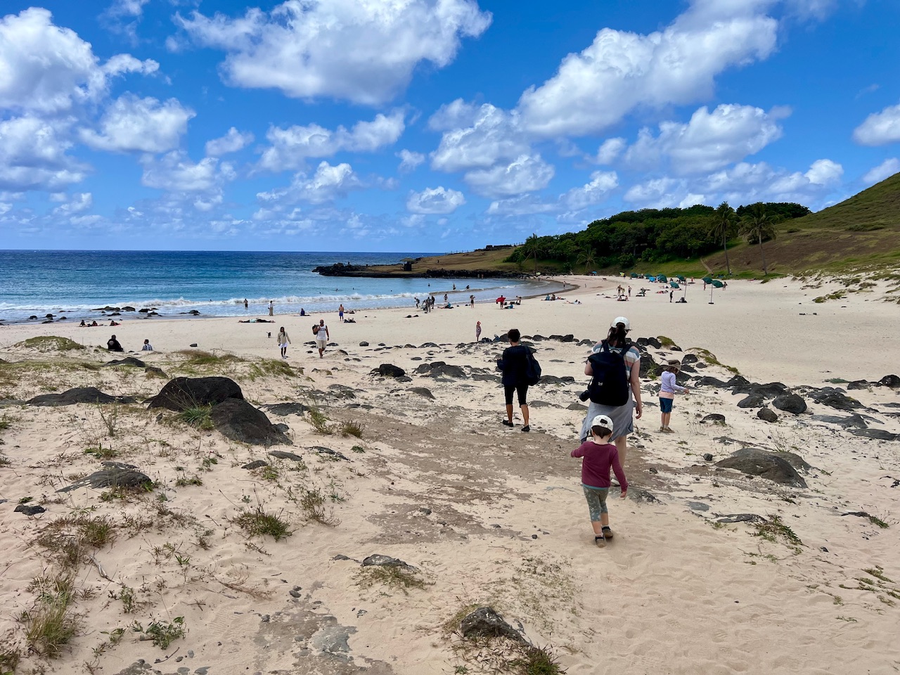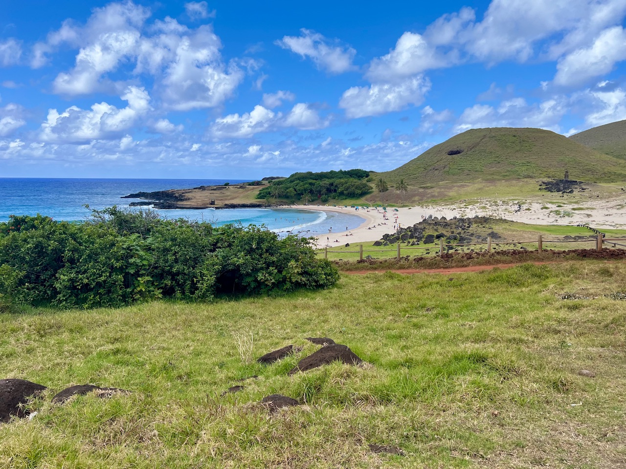 Mittlerweile können wir uns vor lauter Steinfiguren ja kaum noch konzentrieren - es wird also Zeit für eine ordentliche Pause. Dazu besuchen wir den einzigen Sandstrand der Osterinsel und lassen uns hier die angenehme Seeluft um die Ohren pusten. Hier finden heute außerdem mehrere Hochzeiten statt, die allesamt hier in großen Zelten feiern.