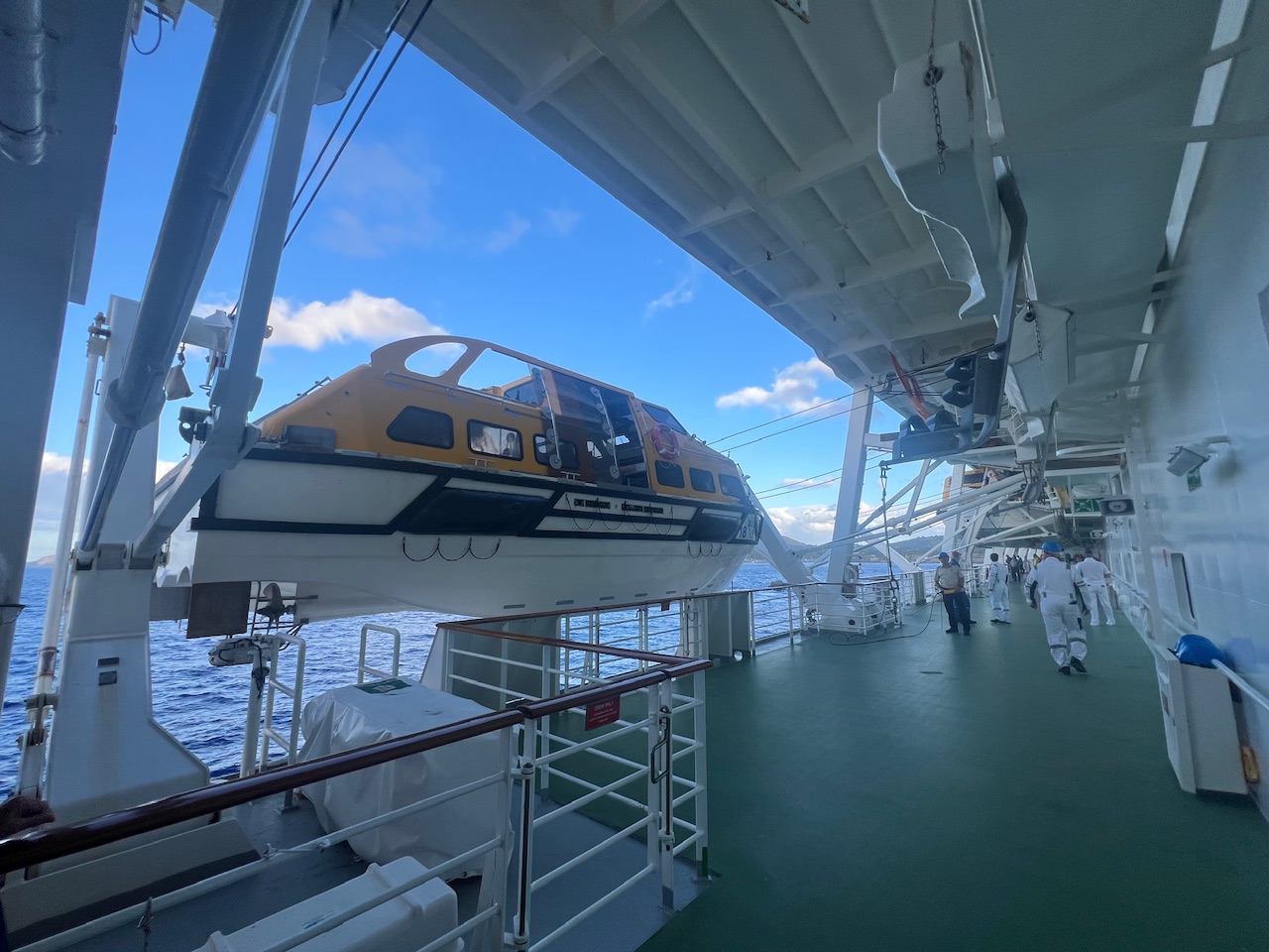 Wir können vom Balkon aus noch Beobachten, wie unsere Tenderboote wieder aufgenommen werden, und für den nächsten Einsatz verstaut werden. Das dauert heute erstaunlich lange, aber wir haben ja Zeit.