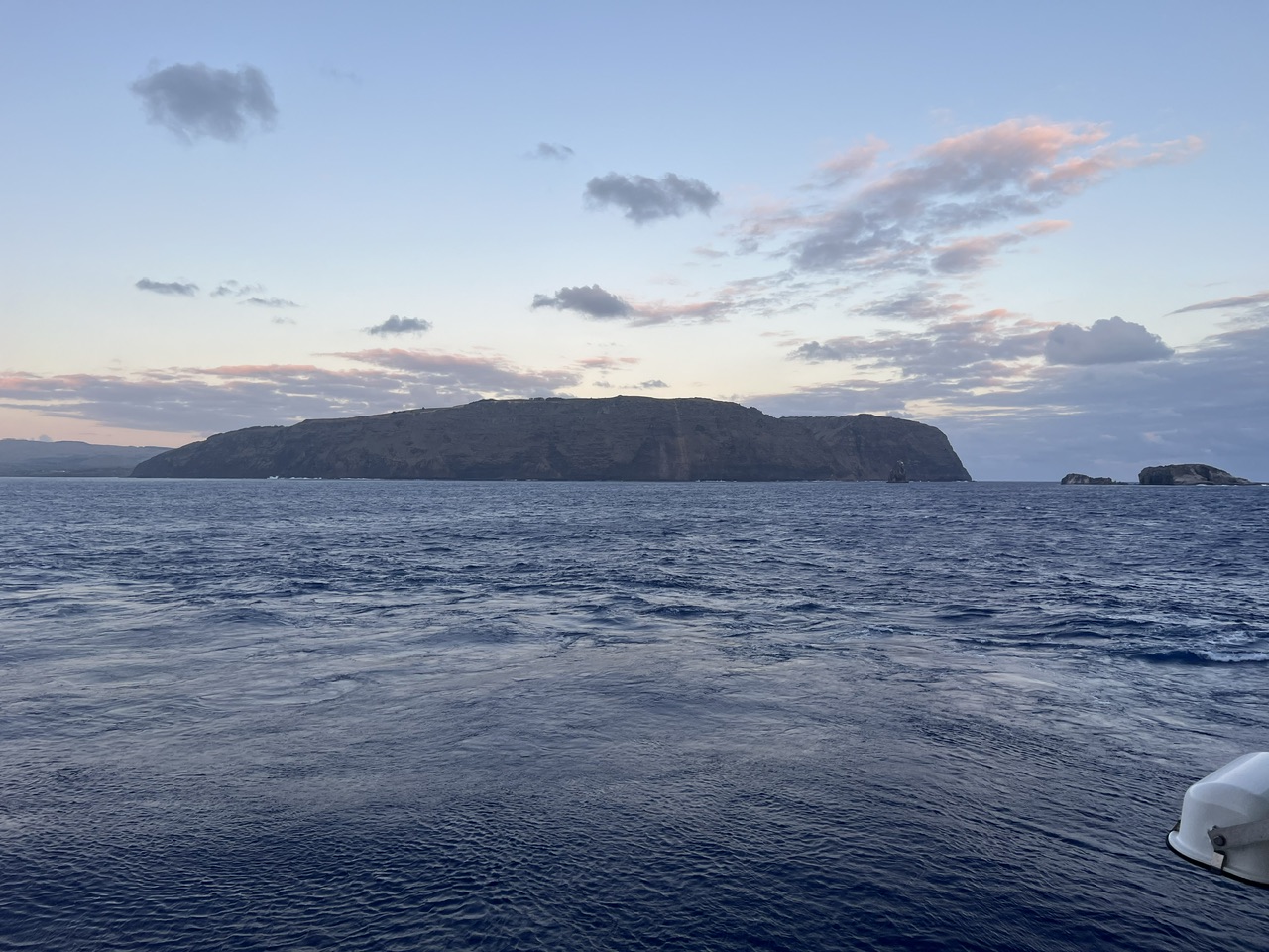 Zur Abfahrt gibt es dann noch eine Überraschung von unserem Kapitän. Wir fahren nicht direkt los in Richtung Süden, sondern fahren von der Seeseite nun noch mal den Vulkan an, den wir vorhin bereits von der Landseite aus erkunden konnten. Hier machen wir mit dem Schiff erneut eine komplette Drehung, sodass alle Gäste mal einen Blick erhaschen können. Die Insel ist mittlerweile in ein kräftiges Orange getaucht, und so verabschieden wir uns mit einem letzten Hupen im Sonnenuntergang von der Osterinsel.