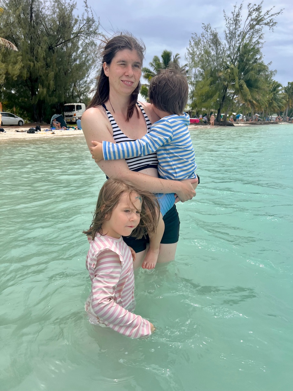 Am Strand angekommen suchen wir uns dann zwischen den diversen gelb-weiß gestreiften Handtüchern ein Plätzchen. Es windet ziemlich stark, also lieber nicht direkt unter einer Palme. Dann geht es für uns alle vier direkt ins Wasser. An dieser Stelle ist es relativ lange sehr flach, und selbst danach wird es nur kurz etwas tiefer, bevor man auf einer riesigen Sandbank steht. Selbst die Kinder können fast die ganze Zeit bequem stehen. Theo ist es dennoch etwas unwohl, so weit draußen zu sein. Dass er trotzdem normal stehen kann, beeindruckt ihn wenig. Dafür hat Lotti umso mehr Spaß und übt trotz der Strömung fleißig Schwimmen.