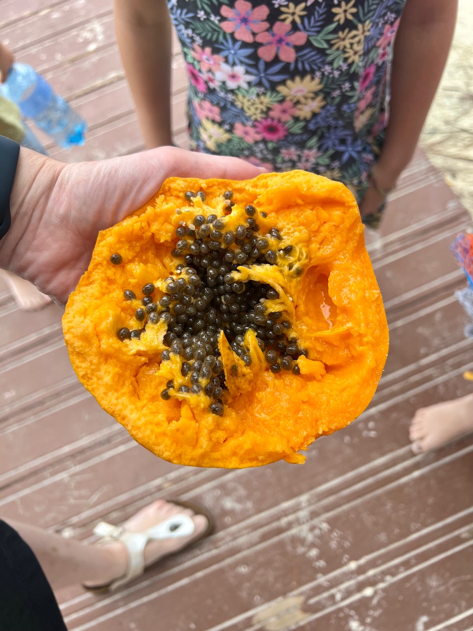 Nachdem alle ausgiebig gebadet haben, sieht es aus, als würde ein Schauer über die Insel ziehen. Wir machen uns trocken und essen am Steg die frisch gepflückte Papaya – rustikal mit den Fingern, zusammen mit einer anderen Familie.
