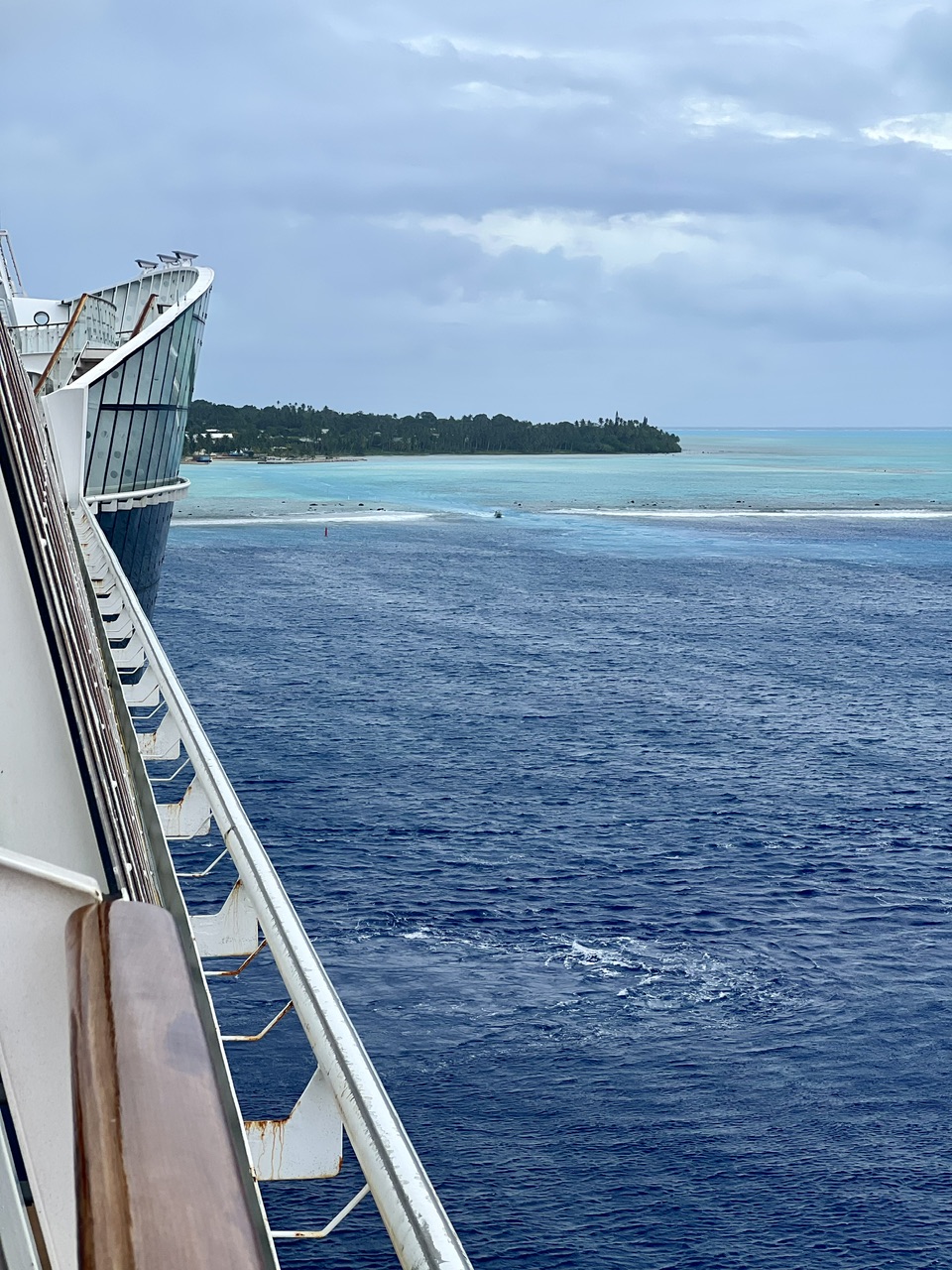 Wir kommen pünktlich am Morgen vor der kleinen Insel an. Anlegen können wir hier nicht, es gibt nicht mal einen richtigen Hafen. Es ist also wieder einmal an der Zeit, in die Tenderboote zu steigen und über diesen Weg an Land zu gelangen. Es ist außerdem der letzte Tenderhafen auf dieser Reise. Schon vom Balkon aus können wir die tollen Türkistöne des Wassers erkennen. Auch wenn wir heute wieder nicht mit viel Sonnenschein rechnen können, soll es wenigstens trocken bleiben.