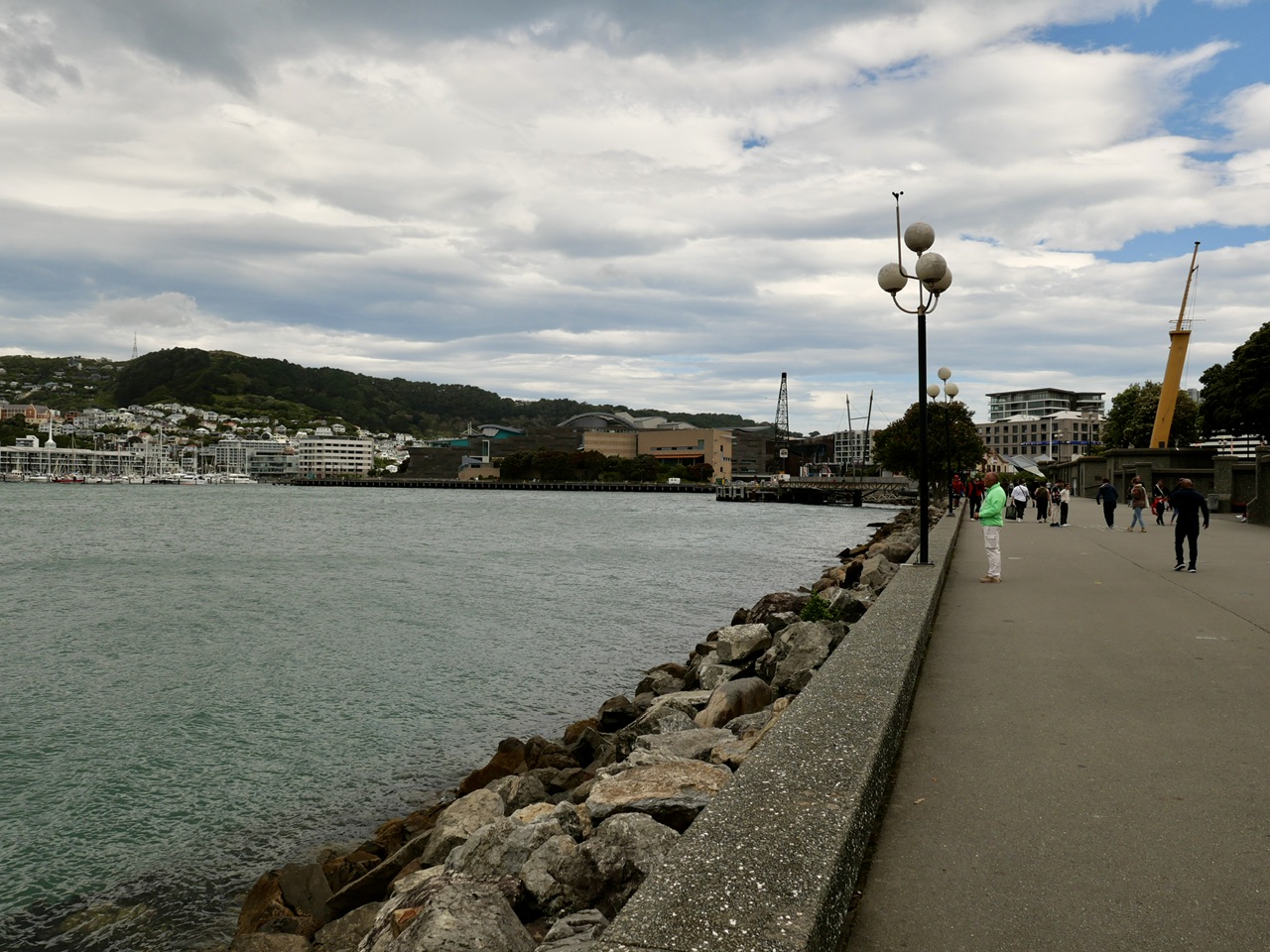 Nachdem das Auto gebucht und auch die Kinder alles erklettert, geschaukelt und gerutscht sind, gingen wir weiter am Wasser entlang. Wellington macht heute seinem Namen „Windy City“ alle Ehre. Der Wind weht kräftig durch die Bucht. Wir kaufen unbeirrt mal ohne die Ritzen zu berühren, mal auf Mauern balancierend in Richtung Te Papa Museum. Ein Besuch haben wir aus Zeitgründen zwar nicht geplant aber es ist so schön hier an der Promenade. Eine Fortbewegungsart war auch von Bank zu Bank springend. Lotti die schon wie die ganze Reise wie eine Meisterin den ganzen Tag gelaufen ist hat ihre Kraft ein bisschen überschätzt und hat sich ziemlich doll am Schienbein gestoßen. Danach ging nichts mehr. Jeder mit einem Kind auf den Schultern haben wir uns noch zu dem Wellington Schriftzug geschleppt und Fotos gemacht. Dann ging es nur noch zum großen Parkplatz und in den uber zum Shuttle und zum Schiff.