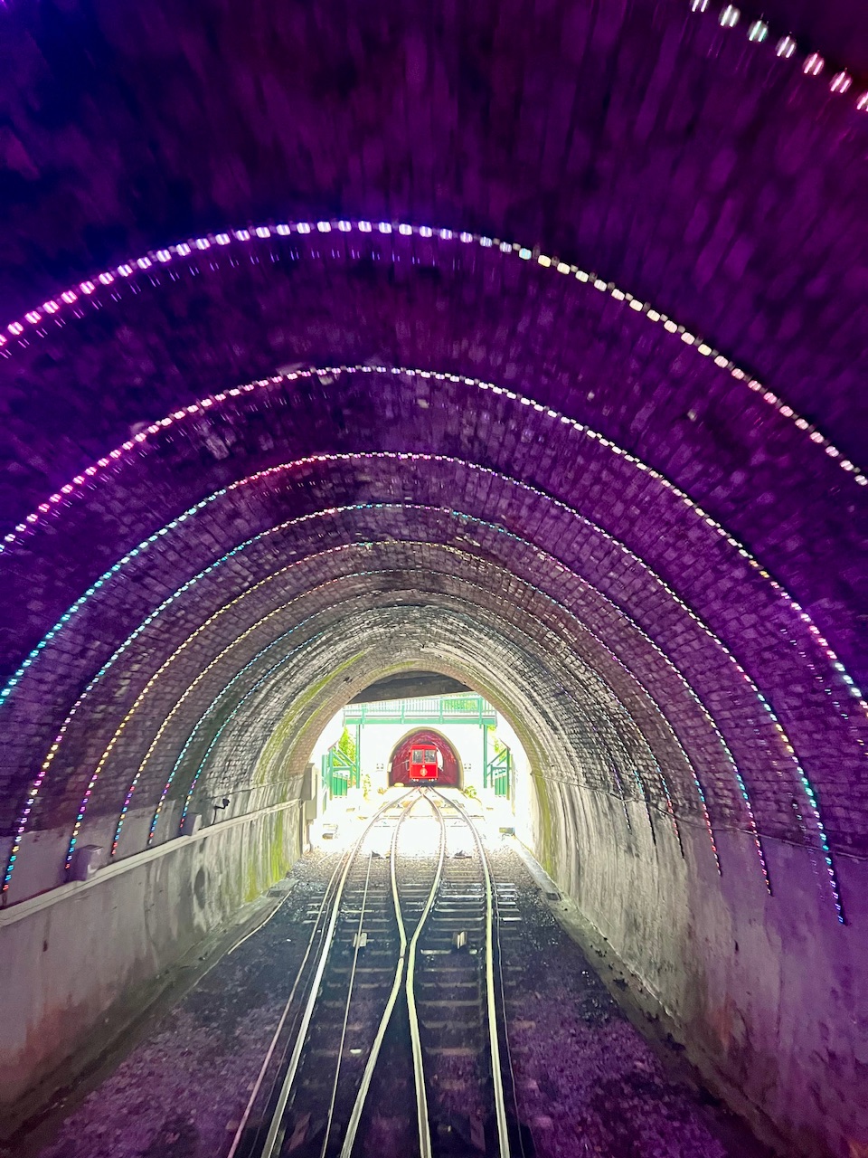 Auch ihren Hinweis, die Tickets für die Seilbahn doch schon auf dem Weg online zu buchen, beherzigen wir, und können so an der ganzen Schlange vor der Kasse einfach vorbei ziehen. Besonders für die Kinder wird die kurze 5-minütige Fahrt zum echten Abenteuer. Vor allem als wir kurz nach Abfahrt noch erfahren, dass es in den zwei Tunneln die wir durchfahren müssen, im Moment eine spezielle weihnachtlichen Beleuchtung gibt. Nachdem es auf dem Schiff noch immer an Weihnachtsdeko fehlt, ist das für uns alle eine tolle Überraschung. Am Ende freuen sich also nicht nur die Kleinen über die vielen bunten Lichter im Tunnel.