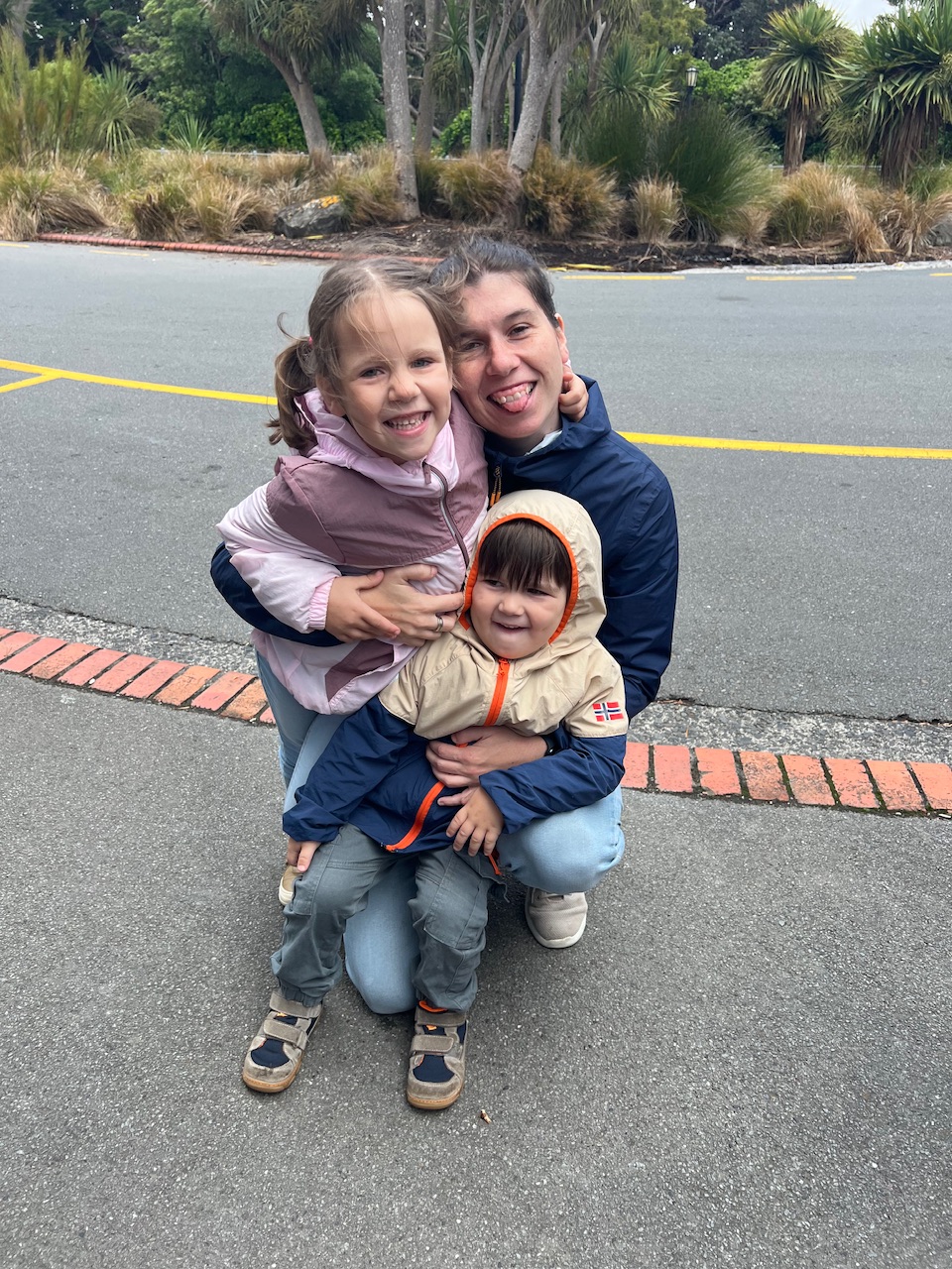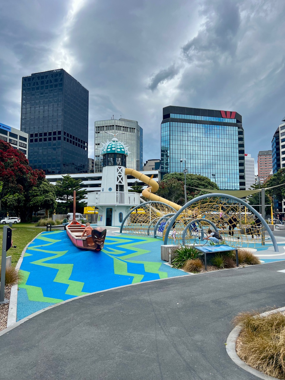 Kurz darauf kamen wir zufällig an genau der richtigen Stelle der Hafenpromenade an - an einem Spielplatz. Da wir noch nach einem Mietwagen für morgen schauen wollten, legten wir den Stop sehr gerne ein. Theo spielte im Maori Kanu und Lotti kletterte mit anderen Kindern der Aida die auch hier waren im Rutschenturm.
