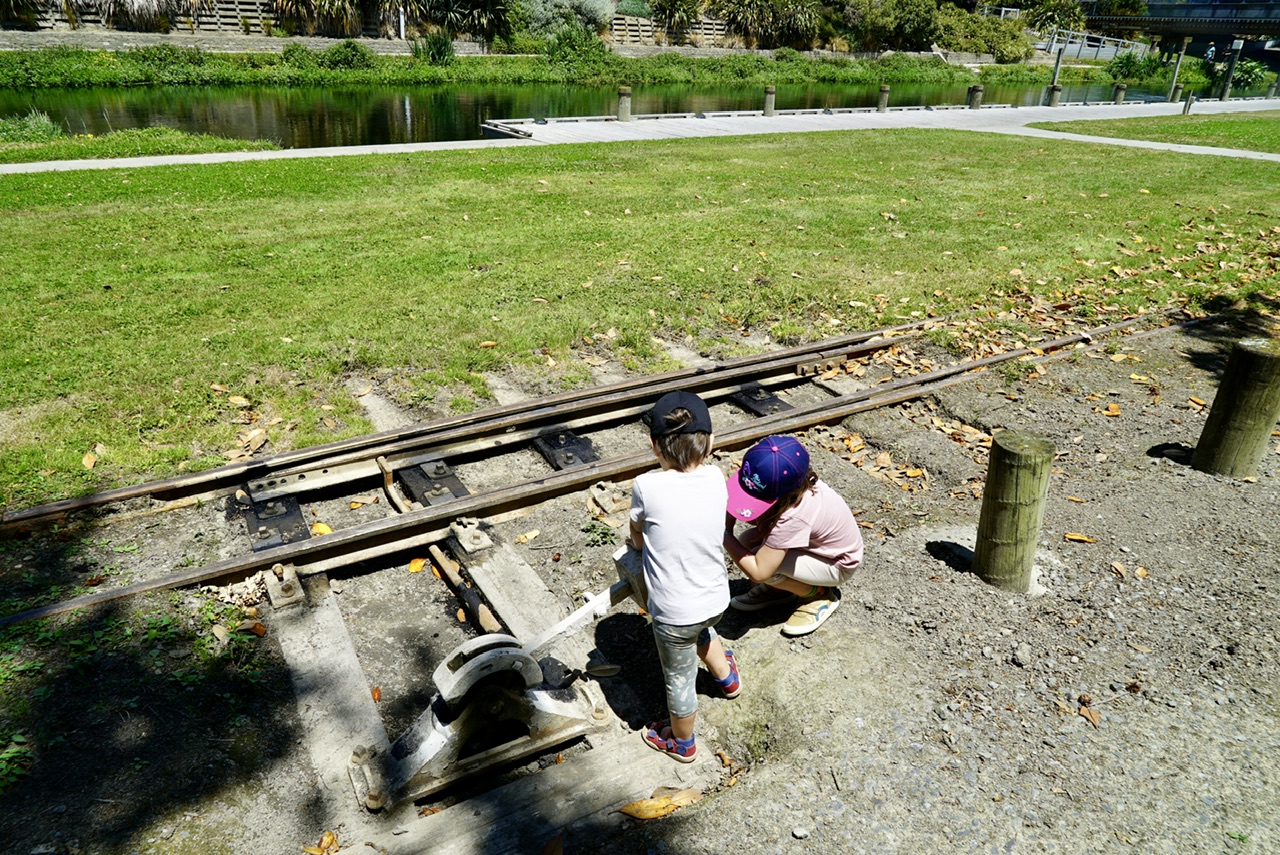 Theo ist vor allem von den Bahnschienen einer Bimmelbahn begeistert. Da diese aktuell nicht fährt kann er dort über die Schwellen klettern wie er fröhlich ist. Als wir dann noch eine Weiche entdecken ist er ja vollends begeistert.