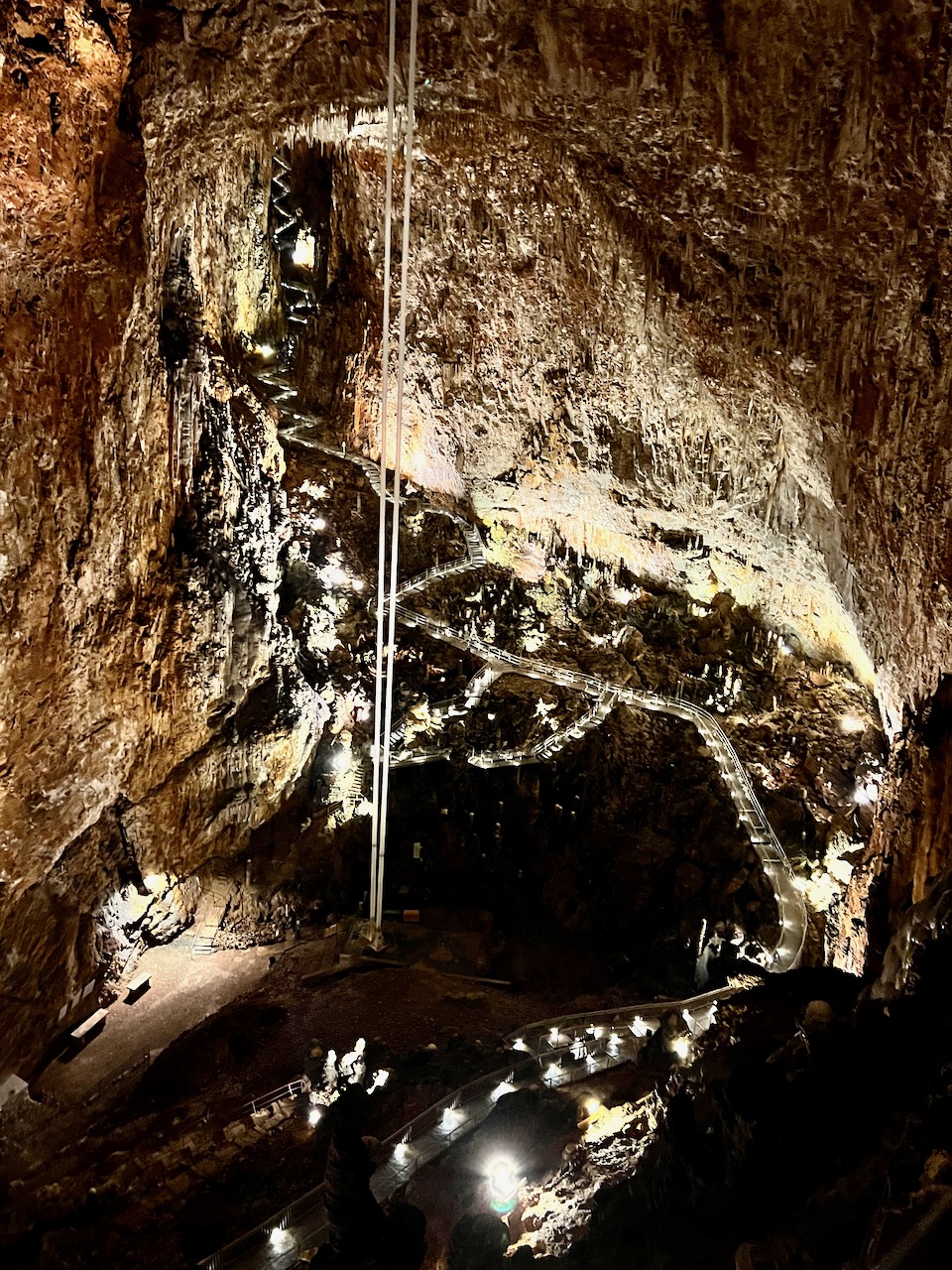 In der Höhle befinden sich zwei geodätische Pendel mit rund 100 m Länge zur Erforschung der Erdgezeiten. Das sind die beiden Plastikröhren die von der Decke hängen. Neben der Höhle befindet sich ein Speleogiemuseum mit zahlreichen höhlenkundlichen, geologischen und paläontologischen Exponaten. Das Museum lassen wir aber aus. Wir haben das Glück, dass die circa einstündige Tour durch die Höhle genau beginnt, als wir am Eingang der Grotte ankommen. So müssen wir nicht lang warten.