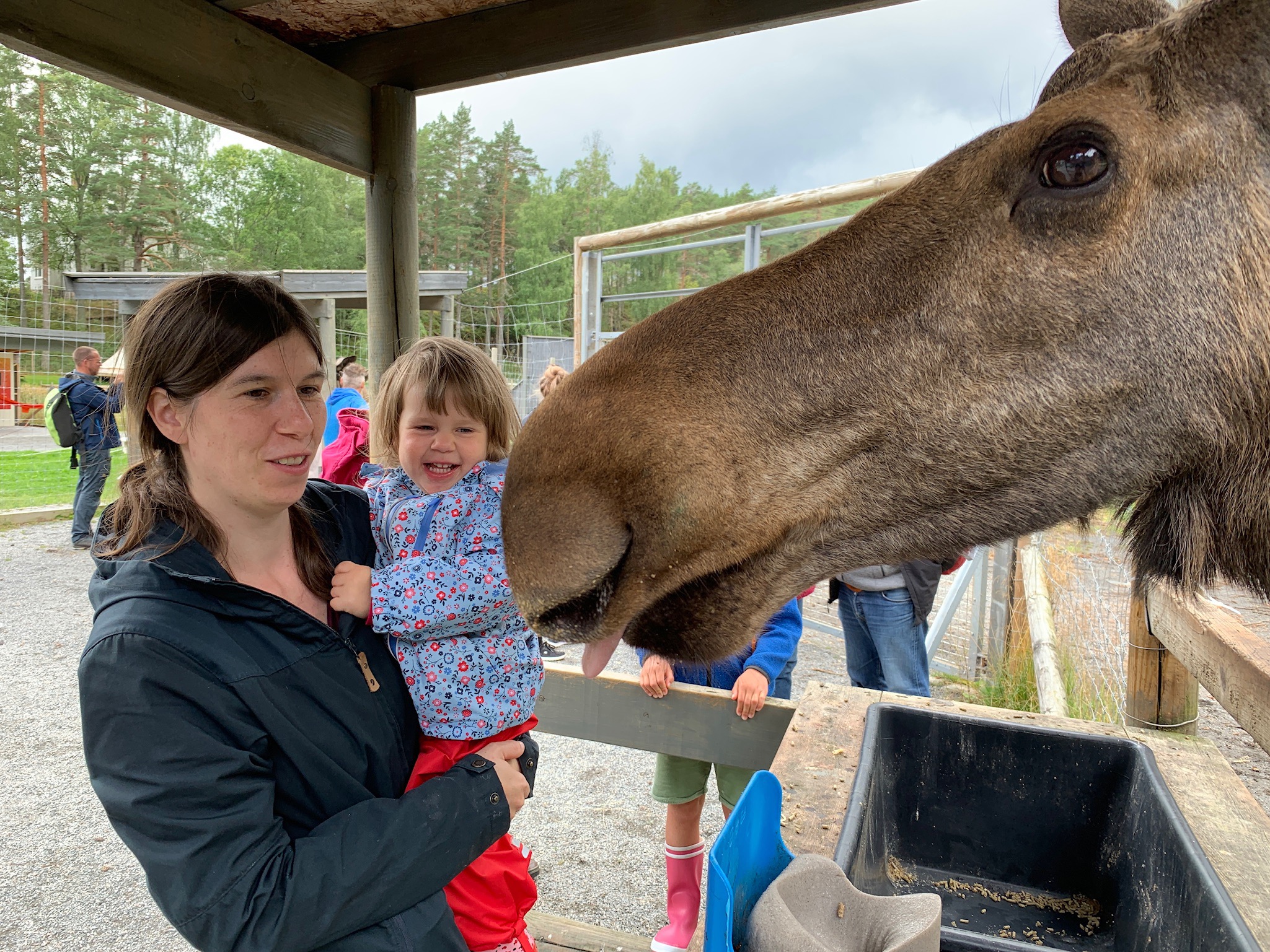 Der Elchpark beherbergt 2 Elchbullen, 2 Elchkühe und zwei Zwillingspärchen Elchbabys, 10 und 18 Monate alt. Die warten nun ungeduldig von uns und weiteren Schaulustigen gefüttert zu werden.