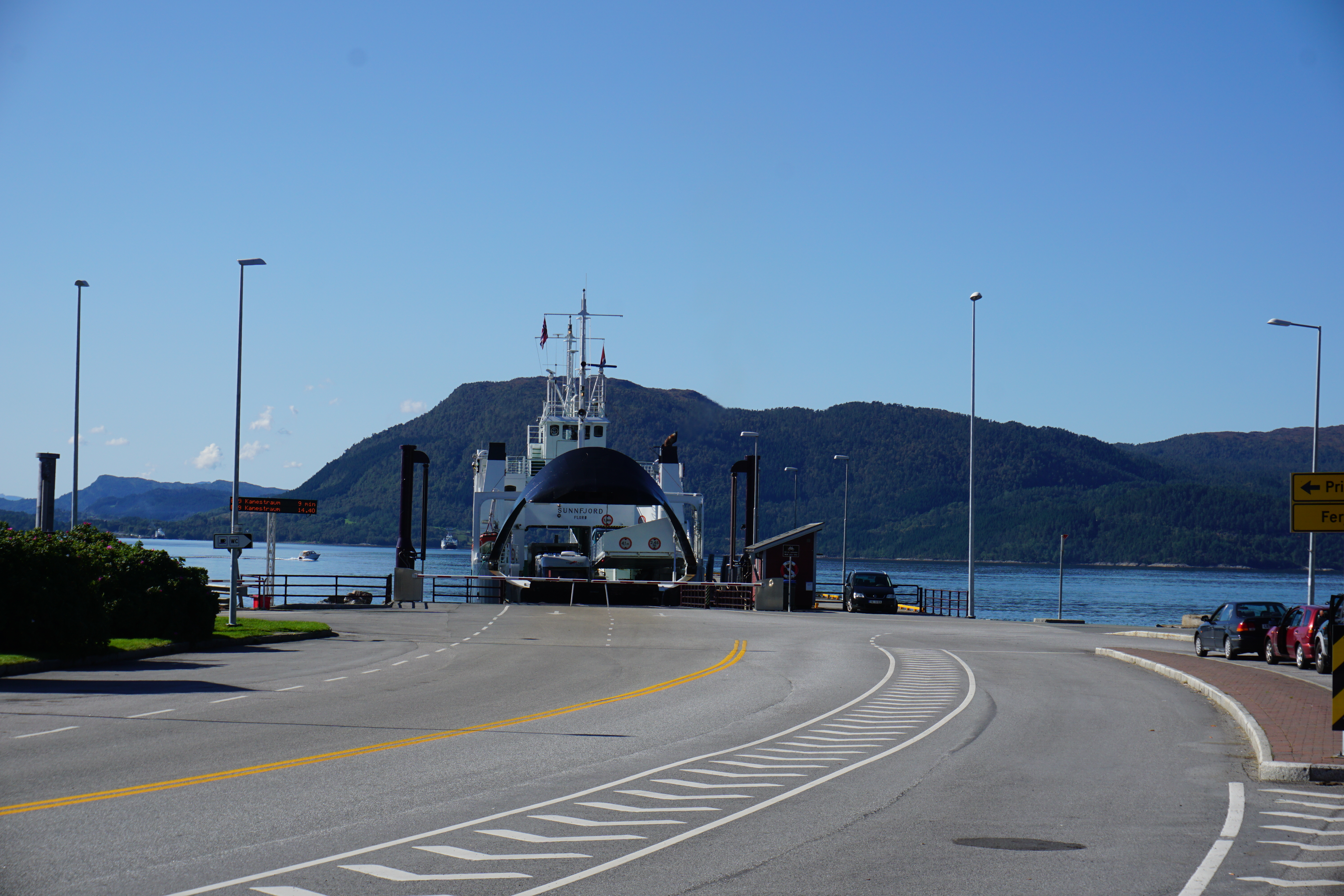 Einen Teil unserer Fahrt heute konnten wir nicht selbst durchführen, weil Karlson das Schwimmen noch nicht gelernt hat. So endete die E39 plötzlich vor dem Wasser. Wenn man zuvor noch ewig auf fast menschenleeren Straßen unterwegs war, findet man sich nun auf einmal in einem Tross von Autos wieder. Wo auch immer die auf einmal alle herkommen.