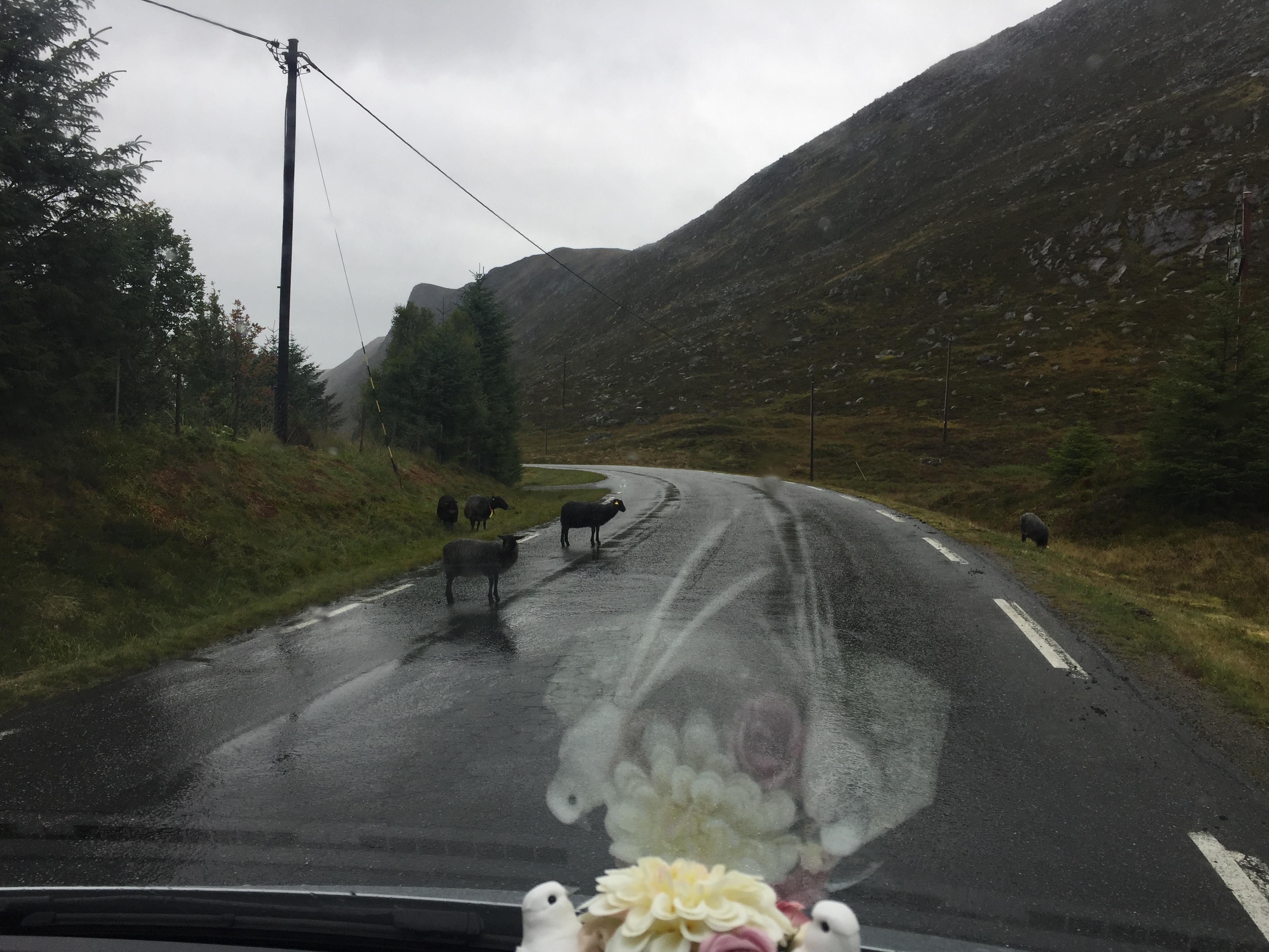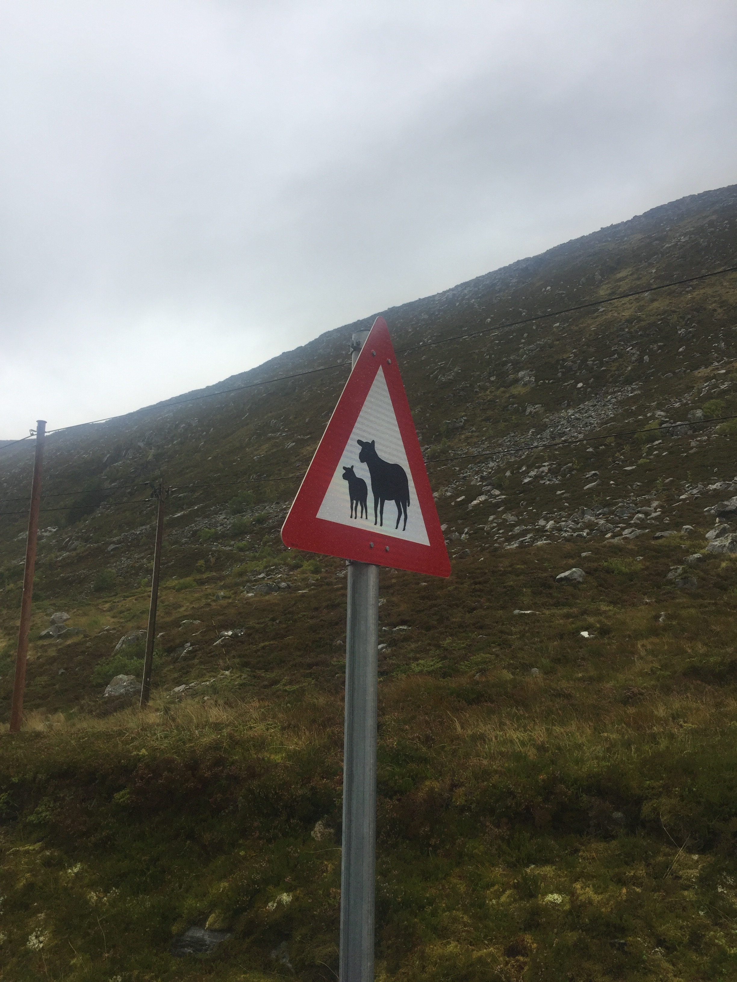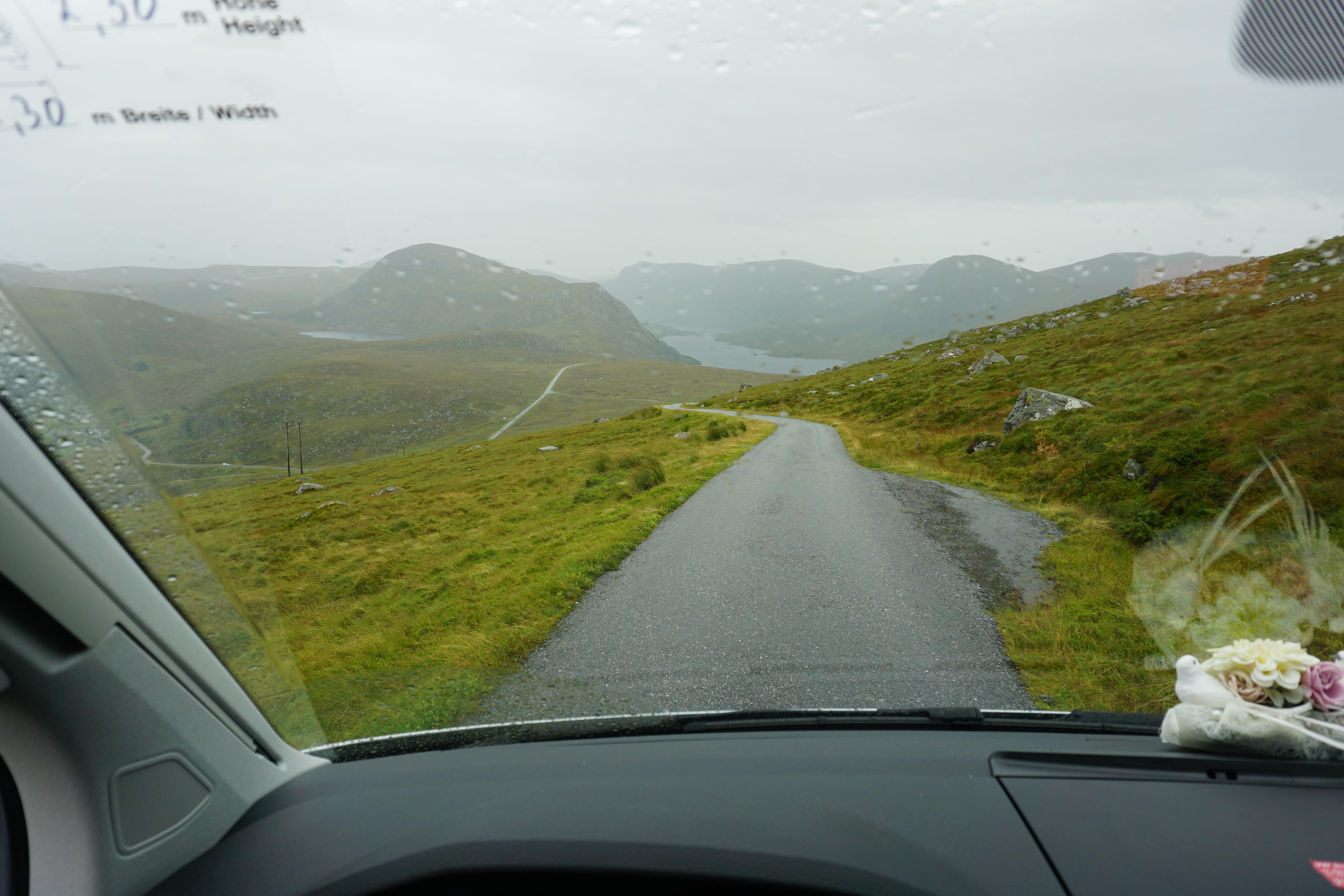 Wir machen uns trotzdem auf den Weg weiter Richtung Süden. Unser heutiges Ziel ist der westlichste zu erreichende Punkt von Norwegen, das Westkap. Vor allem bei schönem Wetter soll man von dort eine super 360 Grad Aussicht haben. Bei schönem Wetter. Es regnet immer noch. Wir fahren trotzdem die einspurige Straße hoch, die sich um jeden Fels windet, der ihr im Weg lag. Ab und zu kommt einem auch mal jemand entgegen, dann wartet einer in den Haltebuchten, die ungefähr halb so groß sind wie Karlson. Auf der Straße nach oben überfährt man immer wieder Gitter, die Tiere am überqueren hindern sollen. Es kündigen sich also bereits Schafe an. Nicht nur die Gatter verraten sie, sondern auch die Kökelspuren, die sich am Fahrbahnrand hinwegziehen.