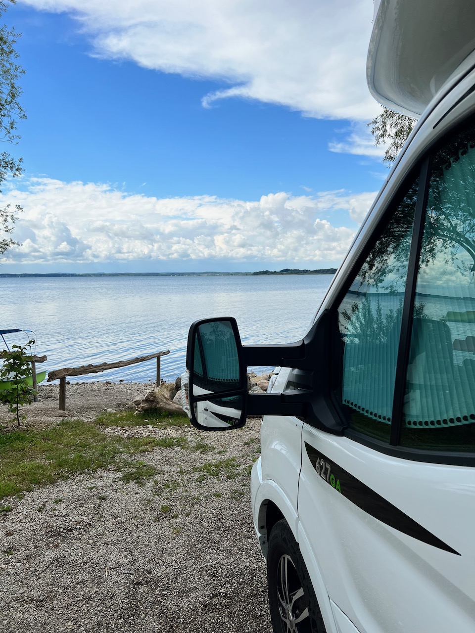 Um München rum fing es an zu regnen und zu hageln und die Autobahn wurde immer voller und die Motivation der Mitreisenden sank. Wir verließen zum Glück ziemlich bald die Autobahn und fuhren weiter auf einer Bundesstraße. So bekamen wir etwas mehr von Bayern und seinen Dörfern zu sehen. Kurz vor 16 Uhr erreichten wir dann endlich den Campingplatz direkt am Chiemsee, nahe des Ortes Chieming.