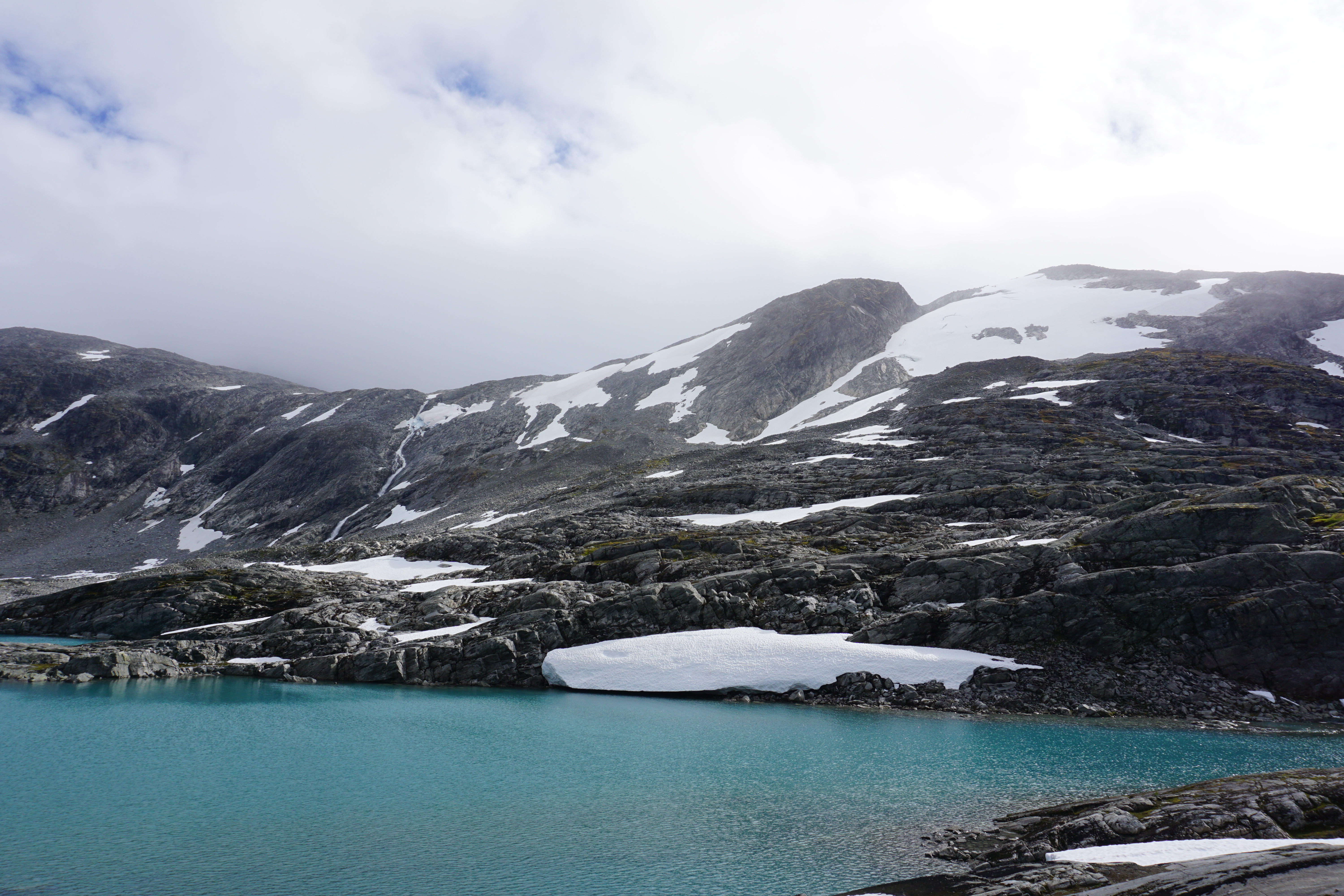 Immer wieder liegen Schneeflecken direkt neben der Straße. Besonders dicht kommt man diesen bevor der Weg zu Ende ist und man wieder auf die E15 trifft und damit zurück in die grüne Fjordwelt eintritt.